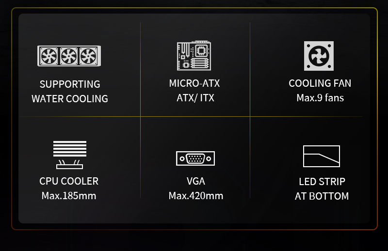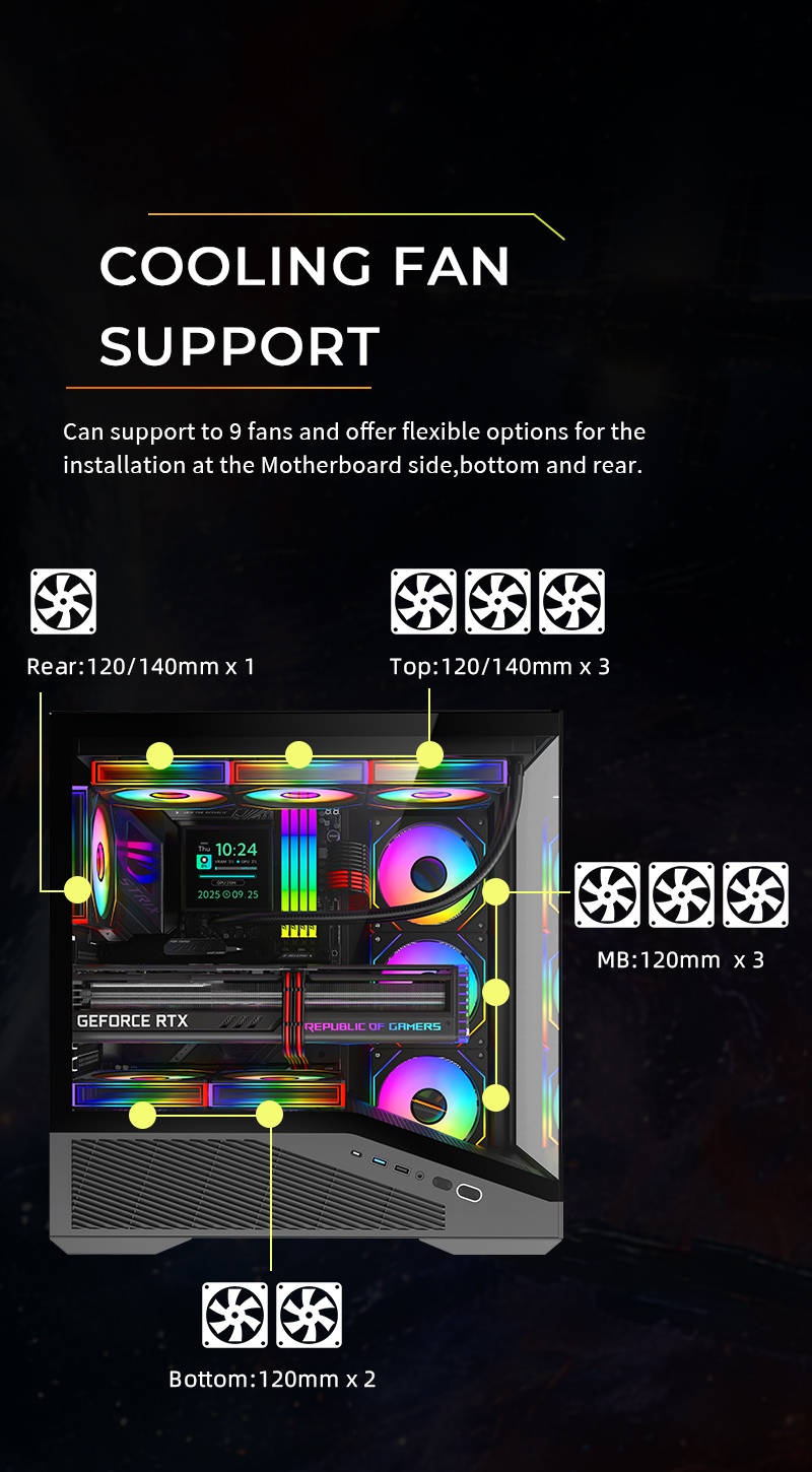 Supporting Fans Top 12cm*3pcs/14cm*2pcs, Bottom 12cm*2pcs, Rear 12/14cm*1pc , Motherboard side 12cm*3pcs